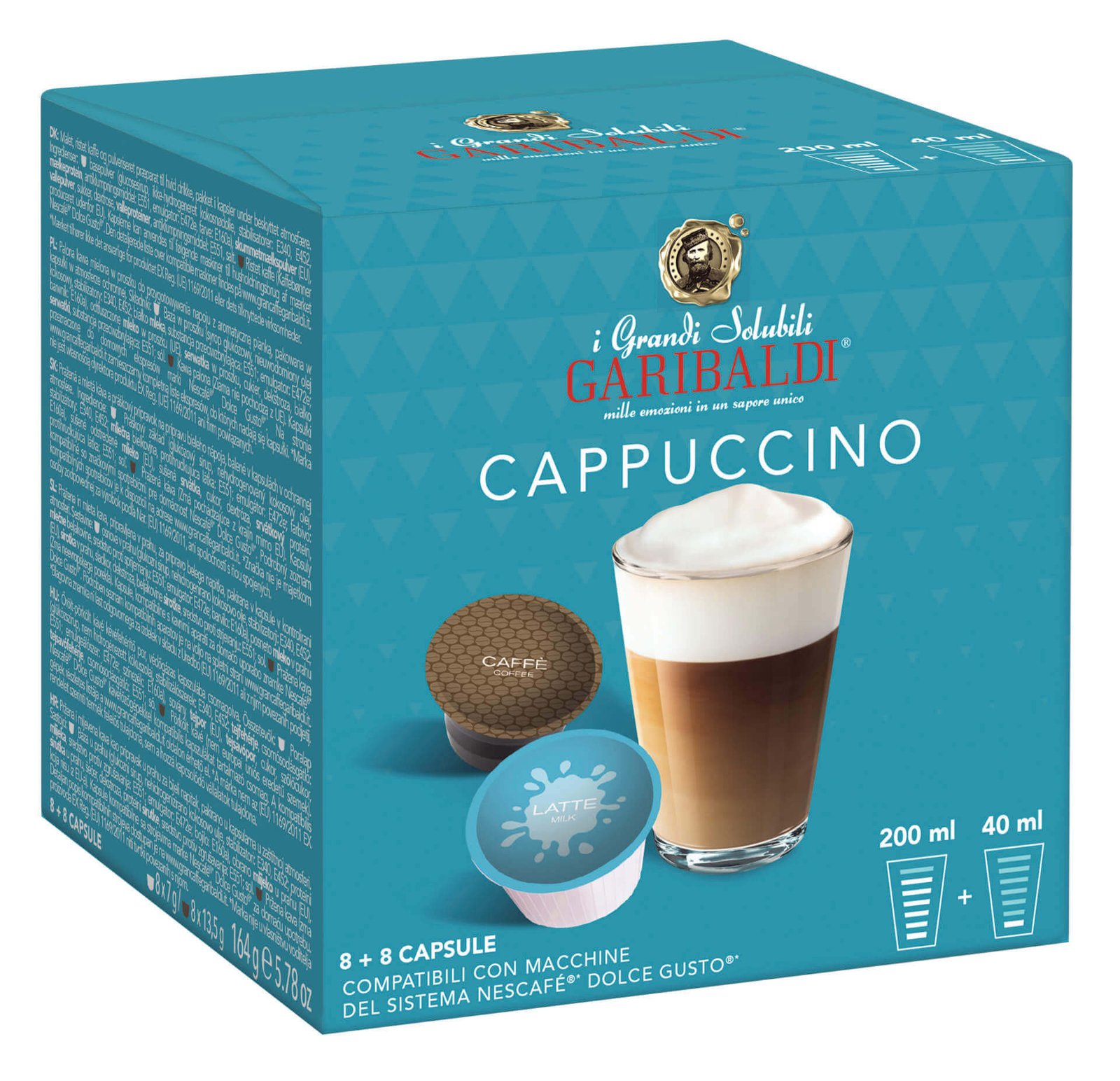 Kastītē ir 16 kapsulas (8 kafijas kapsulas + 8 piena kapsulas), kas paredzētas NESCAFÉ® Dolce Gusto® kapsulu kafijas automātiem, lai pagatavotu 8 tasītes GARIBALDI Cappuccino kafijas. Kafija ir iepakota īpašās hermētiskās kapsulās. Tādējādi kafija saglabā savas raksturīgās īpašības pat pēc daudziem mēnešiem.