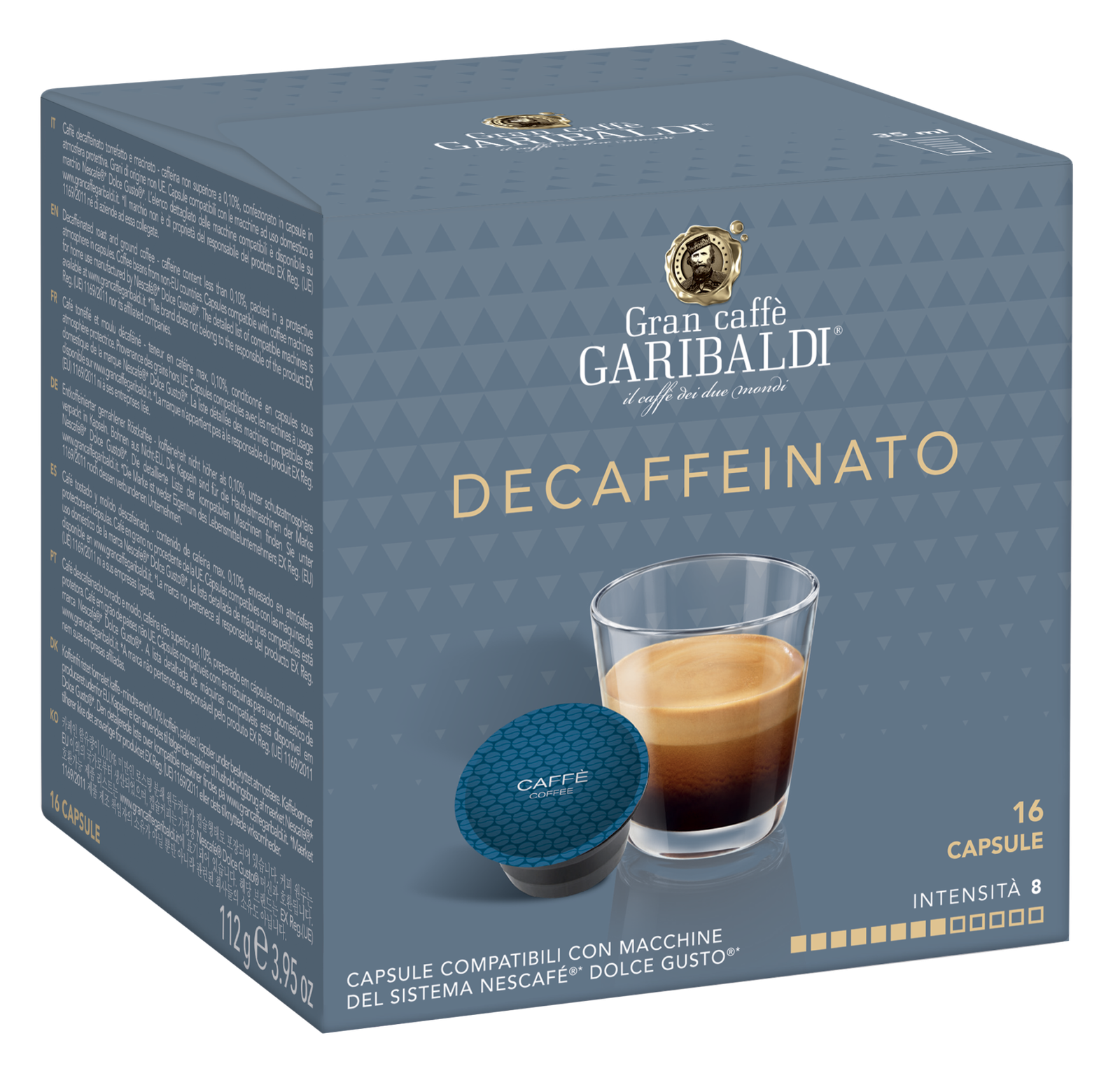 Kastītē ir 16 kapsulas, kas paredzētas NESCAFÉ® Dolce Gusto® kapsulu kafijas automātiem, lai pagatavotu 16 tasītes GARIBALDI Decaffeinato kafijas. Kafija ir iepakota īpašās hermētiskās kapsulās. Tādējādi kafija saglabā savas raksturīgās īpašības pat pēc daudziem mēnešiem.
