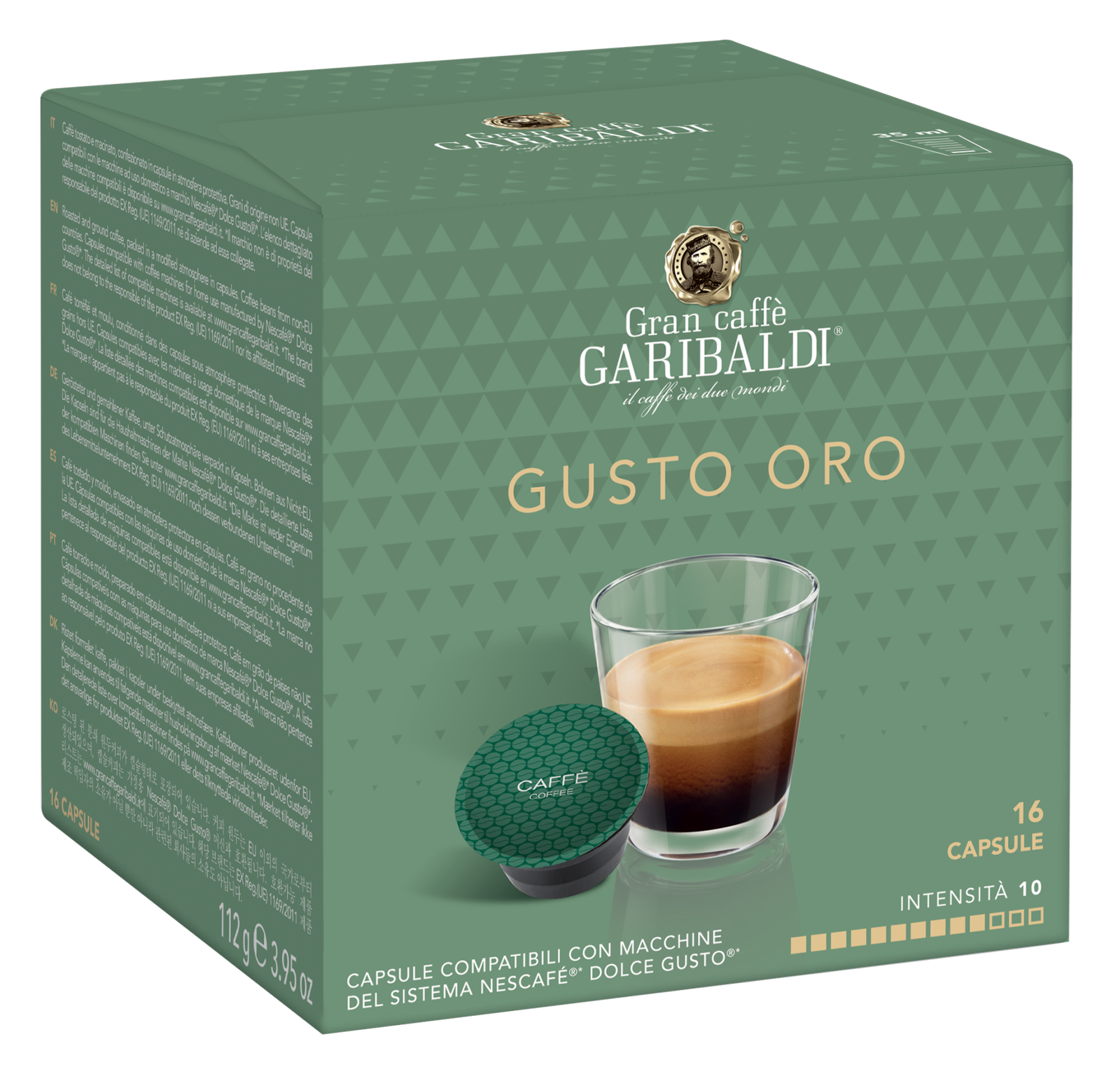Iepakojumā ir 16 kapsulas, kas paredzētas NESCAFÉ® Dolce Gusto® kapsulu kafijas automātiem, lai pagatavotu 16 tasītes GARIBALDI Gusto Oro kafijas. Kafija ir iepakota īpašās hermētiskās kapsulās. Tādējādi kafija saglabā savas raksturīgās īpašības pat pēc daudziem mēnešiem.